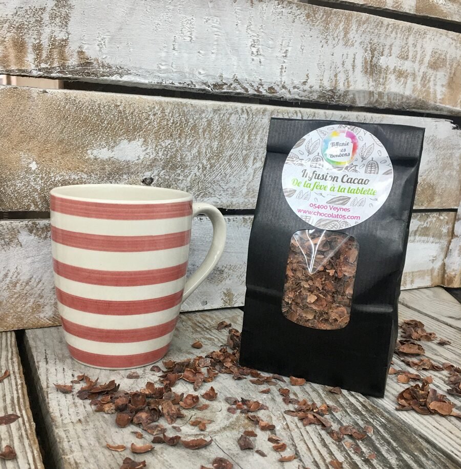 Une fois torréfiées, les fèves sont concassées pour séparer l’écorce du cœur de la fève : le grué de cacao. Un système de ventilation (le vannage) permet de séparer ces deux éléments. Le grué sera utilisé pour la fabrication du chocolat. Je propose l’écorce de cacao pour les infusions. On y retrouve le bon goût du chocolat et beaucoup de bienfaits.